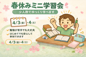 春休みの間、 少人数でゆっくり取り組める「ミニ学習会」を行います。 大人数の塾が苦手なお子さんや、自分のペースで進めたいお子さんに向けた時間です。 「わからないところだけ聞きたい」「宿題を少し進めたい」 そんな使い方でも […]